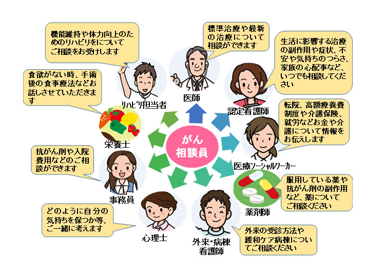 がん患者さん、あるいはご家族の方々は、がんの診断、治療の過程において様々な悩みや不安、苦痛をもたれることと思います。当センターでは、そのような方々を支援するために「がん相談支援センター」を設置しています。がん医療の経験が豊富で生活全般の相談ができる看護師や医療ソーシャルワーカー、場合によってはがん専門の医師、薬剤師、管理栄養士などが、患者さんやご家族からのがんに関する治療や症状、療養生活全般について疑問や悩みをお聴きし、よい方法を見つけるお手伝いをさせていただいています。