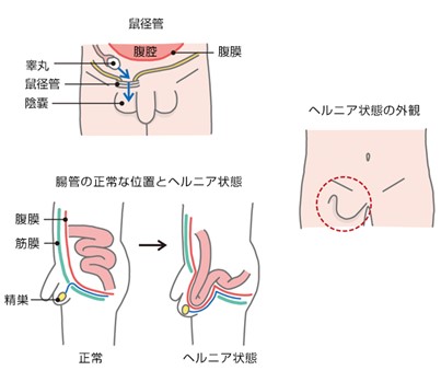腹腔内にはさまざまな臓器(小腸・大腸・脂肪組織など)がおさまっています。 これらの臓器が腹腔内におさまるように壁となって支えているのが、腹壁を構成している筋肉や筋膜です。加齢によって、この筋肉や筋膜が弱くなったり、ゆるんだりすると、特に鼡径部の筋肉の壁にすき間や穴(ヘルニア門)があいたような状態になります。すると、腹腔内の臓器がこのすき間や穴を通って腹腔外にとび出し、鼡径部が膨隆した状態になります。