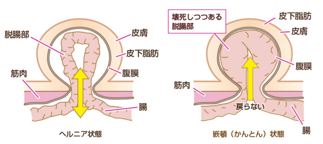 立ち上がったり、お腹に力を入れると腹腔内の臓器がとび出して、鼡径部が膨らみます。この膨隆は親指頭大程度のごく小さなものからソフトボール大くらいまでの大きなものまで、さまざまパターンがあります。男性の場合は膨隆が陰嚢内まで達することもよくあります。これらの鼡径部の膨隆は、体を横にしたり、手で押さえると多くは消失します。 膨隆以外の症状はないことがほとんどですが、あったとしても軽い痛みやつっぱり感がある程度で、強い痛みなど特別な症状はありません。 上記の症状は片側の鼡径部のみならず、同時期に両側に出現することもあります。 また、まれではありますが、とび出した臓器が腹腔内にもどれなくなり、鼡径部が膨らんだままの状態になることがあります。この状態を嵌頓(かんとん)と言います。小腸が嵌頓すると、腸閉塞や腸壊死を発症して、お腹が張ったり、嘔吐したり、強い腹痛などが出現します。嵌頓を解除できない場合には緊急手術が必要となります。