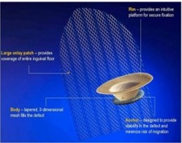 現在、鼡径ヘルニアに対する手術においてはメッシュ(人工補強シート)を用いた手術が主流となっています。腹腔内の臓器が出てこないように、腹壁の穴(ヘルニア門)にメッシュを貼り付けます。メッシュはヘルニア門をふさぐとともに、その周囲の腹壁の弱くなっている部位も補強します。 このメッシュはやわらかくて軽く、体に害がない人工の素材で作られています。手術後の痛みやつっぱり感や異物感が少ないことが特徴です。しかし、感染に弱いという弱点も持ち合わせています。 下の写真のように術式によってさまざまなタイプのメッシュがあります。
