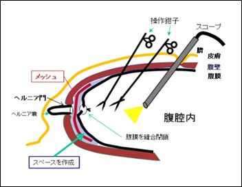 お腹に5-10㎜程度の穴を3か所開けて、腹腔鏡と呼ばれるカメラを使って手術をします。 腹腔内の画像をテレビモニタでみながら、腹腔内側からヘルニア門にメッシュをあてて閉鎖します。 正確な鼡径ヘルニアのタイプ診断が可能で、過不足のない手術ができます。 創が小さいので、術後の疼痛が少なく、早期の社会復帰が可能です。 当院の鼡径ヘルニアに対する標準術式となっています。 全身麻酔で行い、手術時間は前方アプローチ法に比べてやや長くなります。 アプローチ法の違いにより、完全に腹腔内に入るTAPP (Transabdominal preperitoneal approach)法と腹膜と腹壁の間に入ってスペースを作るTEP(totally extraperitoneal approach)法があります。