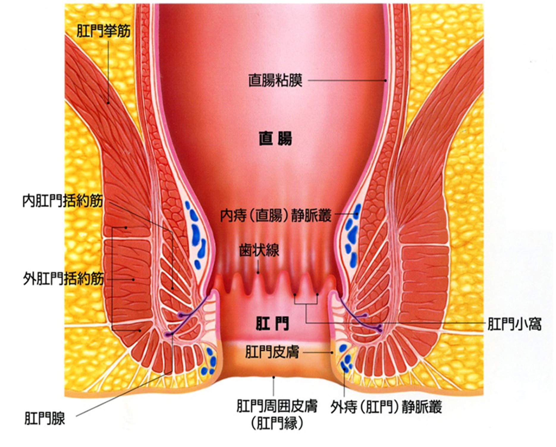 肛門は排泄を司る器官です。 通常は肛門括約筋が緊張し、便やガスが漏れないようになっています。内肛門括約筋は自分の意思と関係なく、直腸に便が送られると弛緩し、排便が促されるのですが、外肛門括約筋は随意筋のため、意識的に肛門を締めたり緩めたりすることができます。血管が網の目状に広がった静脈叢も弾力性に富み、漏便を防ぐ役割があります。便意を催し、トイレでの排便可能な環境が整うと括約筋が弛緩して便やガスが排出されます。この括約筋に締められた4-5cmの管状部分が肛門管です。肛門管(上皮)は歯状線を境に直腸(粘膜)に移行します。 歯状線には肛門小窩(陰窩)と呼ばれるくぼみがあり、排便時に粘液を分泌し、スムーズな排便に寄与します。 肛門や肛門周辺にできる病気を痔と言います。