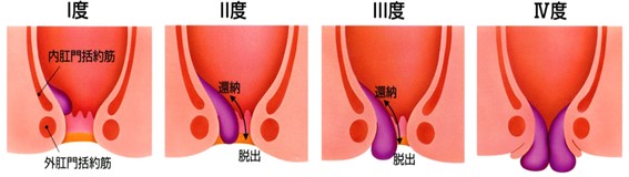 歯状線を境に直腸側にできる内痔核と皮膚側にできる外痔核とに分けられます。通常、内痔核ができ、大きくなり、外痔核を合併します。基本的に内痔核には痛みを伴いません。痛みがある際は・外痔まで広がった内外痔核・血栓(血液の固まったもの)・嵌頓(脱出し、環納できなくなった状態. 括約筋に締められ血流障害を来します)等が考えられます。内痔核の愁訴は排便時の出血や脱出, 外痔核の愁訴は排便時の痛みです。 内痔核は脱出の程度により、上記の如く分類されます。患者さんの症状や病脳期間等を踏まえて手術すべきかを決定します。