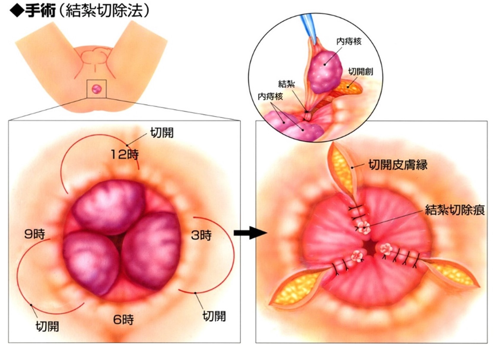 粘膜を電気メスで切開しながら、痔核をはがしていき、最後に痔核の根元で血管を糸で縛った後に、痔核を切除します。吸収糸という溶ける糸を使うため、術後に抜糸の必要はありません。創部は(部分的に)開放創とします。肛門は便の通り道であるため、傷口を縫い合わせてしまうと、縫い目から便が入り込み、化膿してしまうことがあるからです。 内痔核は3カ所できることが多いです(3時 7時 11時方向にできることが多いです)。場合によって創部が3カ所となります。 術後は患部を清潔に保っていただく必要があります。数週間で創部は閉鎖されます。