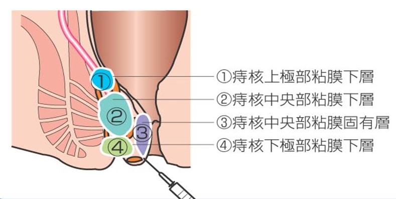 中国の消痔霊という薬液を改良したものです。ALTA(アルミニウムカリウムとタンニン酸)という薬液を痔核に注射することで炎症を惹起させ、組織の修復瘢痕を促し、内痔核を消退させます。 通常、1つの内痔核に対して4カ所注射するため、四段階注射法とも呼ばれます、内痔核の大きさにより薬液量を調整します。