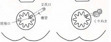 括約筋温存手術くり抜き法(coring out法. コアリングアウト法)、シートン法があります。括約筋の切開を極力最小限とするため、瘻管をくり抜くように切除します。原発口を縫合閉鎖する方法とゴム輪を通すシートン法とがあります。