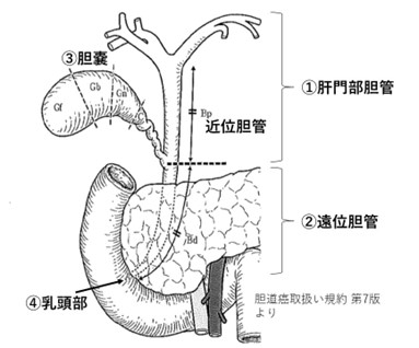 胆道がんは、部位により①肝門部領域胆管がん、②遠位胆管がん、③胆嚢がん、④十二指腸乳頭部がんに分類されます。