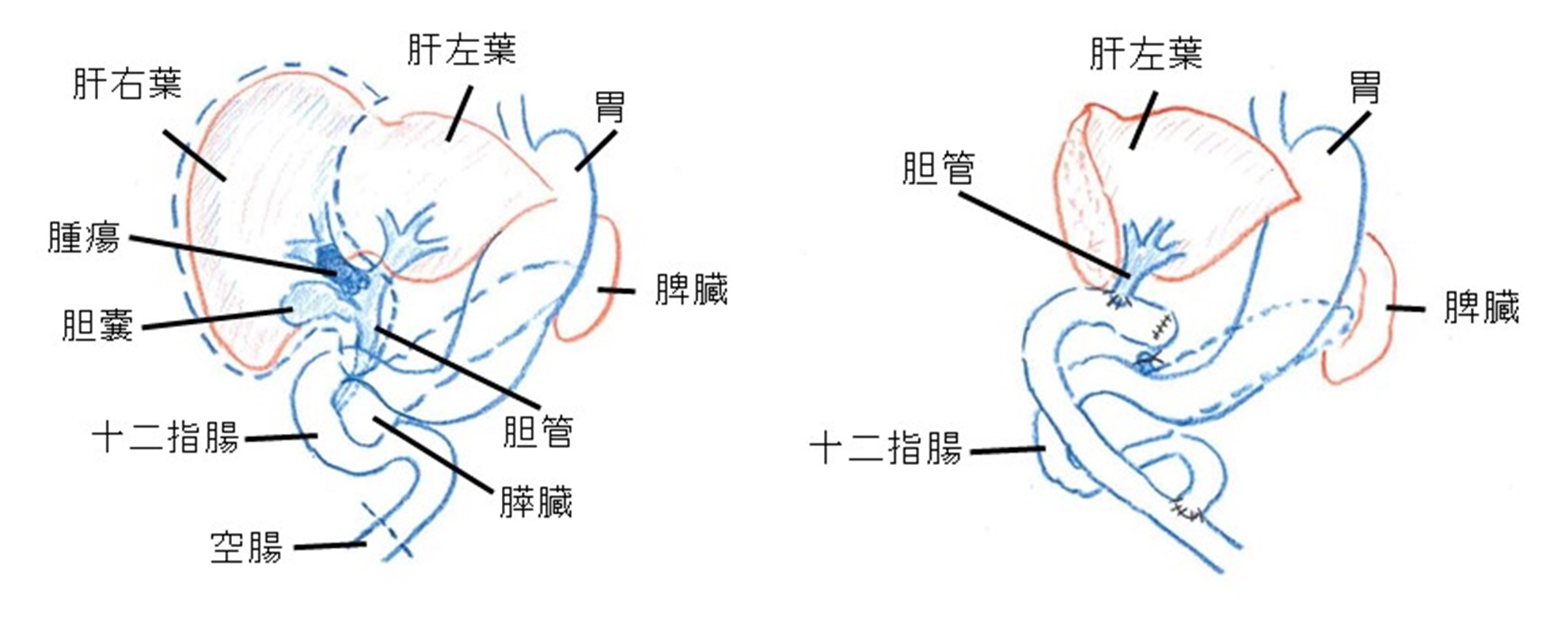 肝門部胆管癌の場合には肝臓の片側(以上)肝切除に胆管空腸吻合を行います。