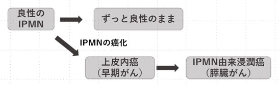 IPMNには膵がんで使われているようなステージ分類は有りません。ただし、良性から悪性(すなわち、膵がん)まで色々な段階があり、ゆっくり進行すると言われています。従って、できれば進行がんになる前に治療することが重要です。データを解析した結果、 IPMNががんになっていることを疑わせる所見について、ある程度のコンセンサスが得られてきました。以下にその内容を簡単にご説明します。