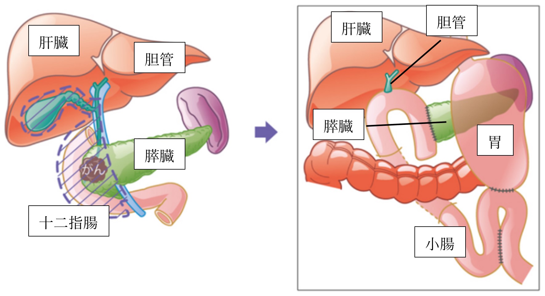 膵頭部は解剖学的には十二指腸や胆管と連続しており、膵頭部を切除するためには十二指腸と胆管、そして胃の一部も切除しなければなりません。また、がんなどの悪性疾患の場合はリンパ節や神経叢も一緒に切除します。肝臓に流入する門脈や肝動脈という血管にも浸潤を認める場合は、門脈・肝動脈も合併切除をして再建術を行います。