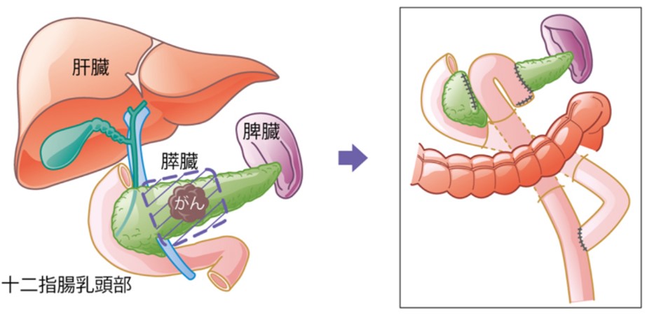 膵臓の原発病巣とともに周囲のリンパ節や膵外神経叢を切除します。がんが膵頭部にある場合には、膵頭部・十二指腸・胆管・胆嚢・胃の一部などを切除する膵頭十二指腸切除術が行われます。がんが膵体部や膵尾部にある場合には、膵の左半分と脾臓合併切除する膵体尾部切除術が行われます。大事なことは手術の前後の全身化学療法まで行うことです。