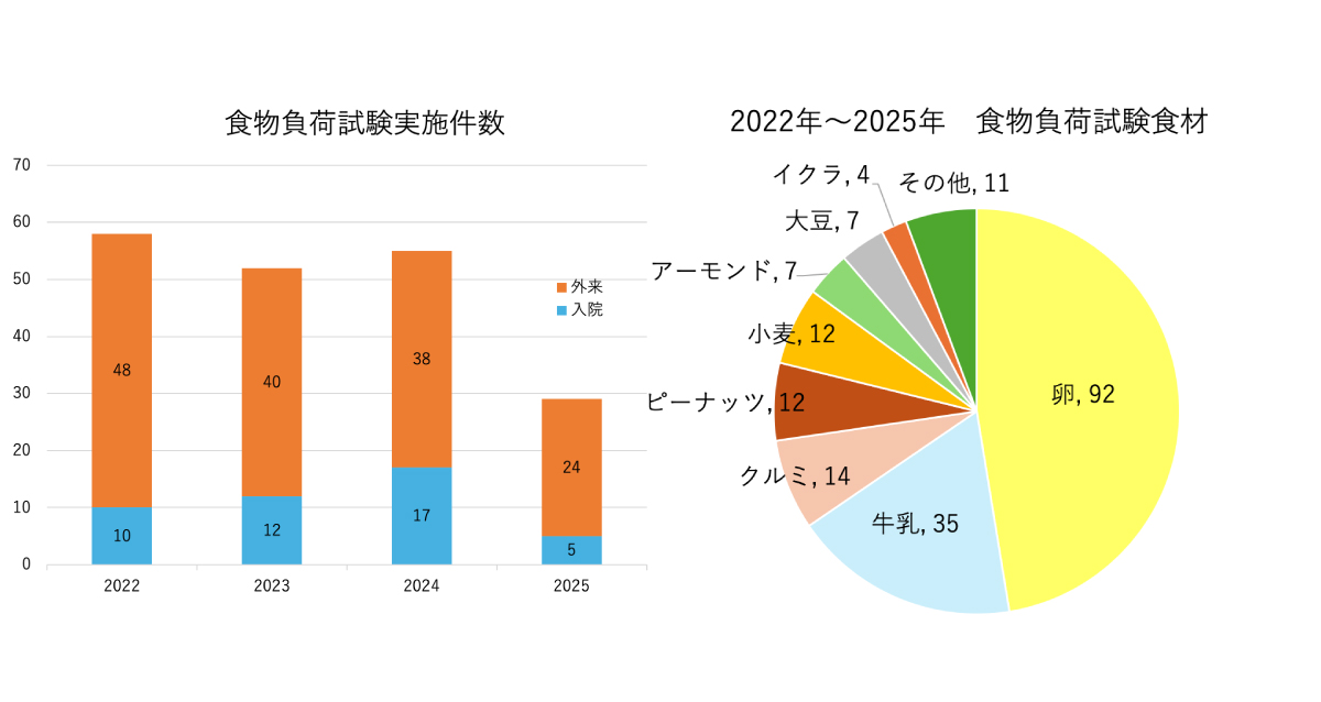 当院では2022年から2025年にかけて、卵・牛乳を中心に、小麦、ナッツ類など多様な食材に対して負荷試験を行っています。年間の実施件数はおおよそ50件前後で推移しており、全国的な傾向と同様に、近年はナッツ類の検査が増加しています。これは、ナッツ入りスイーツや健康志向食品などの普及により、日常的な接触機会が増えていることも背景にあると考えられます。