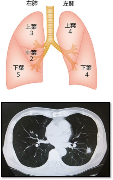 左図のように、肺は左右に5つの袋からなり、これを肺葉と呼びます。右図に描かれている数字は大きさを相対評価しています。中葉が最も小さく、下葉が最も大きくなります。肺がんの多くは検診(健診)の胸部レントゲン検査で発見され、精密検査として胸部CT検査(右図)が行われます。CTでは左右が逆となって写りますので、白い影(腫瘍)は左肺に存在していることになります。ここで初めて、“肺がんの疑い”となります。