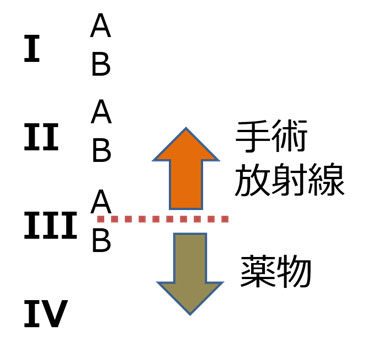 早期の肺がんであれば症状はなく、進行するにつれて症状が現れます。肺がんは肺の根元、心臓周囲のリンパ節に転移して、そこから全身に広がります。この広がりを、胸部CT検査、PET検査、頭部MRI検査で同定し、IからIV期へ当てはめます。一般に肺・リンパ節以外への転移があればIV期となり、薬物治療となります。根治の可能性のある治療の手術や放射線はIIIA期までの場合に適応となります。手術と放射線治療の治療成績の比較では、手術の方が良好であったことからガイドライン(私たちの教科書)でも手術治療が推奨されています。