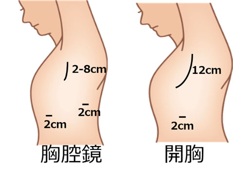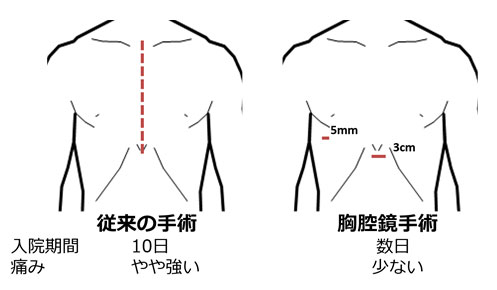 当科では開胸手術(12cmの皮膚切開)と胸腔鏡補助下手術(2-8cmの皮膚切開で胸腔鏡を使用しモニターを見ながら行う)を行っています。手術時間は2-3時間、術翌日から食事を開始していただきます。安静は術当日のみで、術後は十分な疼痛コントロールのもと積極的にリハビリを行っていただきます。