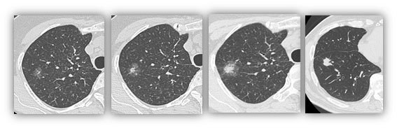 近年、検診CTの普及で早期肺がんが多く発見されるようになりました。図に肺がんの胸部CTを示しますが、淡い影(すりガラス)と濃い白い部分(中心部分)が混在しています。中心部分の割合が多いほど悪性度が高いことがわかっています。肺がんで重要なのはリンパ節転移の有無です。一般に、リンパ節転移がないのであれば、他の臓器に転移の可能性は非常に低くなります。このようながんを画像的非浸潤がんと命名しています。これまでの研究から、中心部分の割合が全体の25%までと定義されています。図では左の2つのCTまでが画像的非浸潤がんにあたります。画像的非浸潤がんの条件を満たした肺癌に対しては、基本的に部分切除を適応させています(中枢病変は例外)。当科ではさらに、リピオドールマーキングを併用した肺部分切除を行っています。