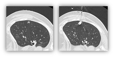 適応となる患者さんに対して、ヨード造影剤へのアレルギーがないことを確認します。手術当日、CT室へ移動してCTで確認しながら非常に細い針で微量の造影剤を腫瘍近傍に打ち込みます(下図1)。
