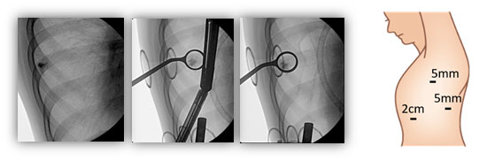 次に、車いすで手術室に移動して手術を行います。手術中はレントゲンに写った造影剤をすべて切り取ることで腫瘍も一緒に切除されてきます(下図2)。そもそも、早期がんに対する部分切除を行うためには腫瘍の局在を確認する必要があります。これまでは直接触ることで腫瘍を確認していたため、傷が大きくなってしまいました。しかし、この方法では腫瘍を触る必要がありませんので、最小限の傷で手術を行うことができます。当科では2㎝の傷1つと5mmの傷2つを基本としています。