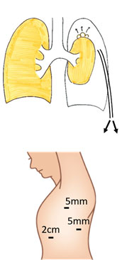 肺は肋骨と筋肉によって作られる器の中に納まっています。その器を胸腔といい、器の表面を覆っている膜を胸膜といいます。肺の中が化膿することを肺膿瘍、肺の外側が化膿することを胸膜炎・膿胸といいます。人体における感染症の基本は適切な抗生剤治療と膿の排除です。胸膜炎・膿胸・肺膿瘍に対する膿の排除には、外科治療が非常に有効で、劇的な回復をもたらします。2㎝の傷3つでの胸腔鏡手術(2時間)で、胸に管が2-3本はいります。抗生剤治療とともに術後7日程度の強力なバキューム治療を24時間継続します。入院期間は術後10-14日間です。