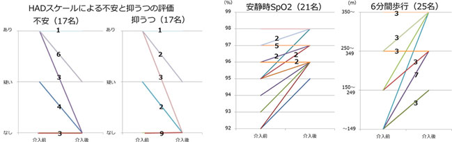 安静時SpO2、6分間歩行距離は介入により、明らかに改善を認めました。また、17名のうち10名が不安状態、6名が抑うつ状態でしたが、介入により16名に改善を認めました。訪問看護・呼吸リハビリが肺切除後の患者さんに貢献していると考えています。